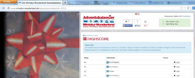 - Veranstalter des Adventskalenderspiels ist die Miniatur Wunderland Hamburg GmbH.