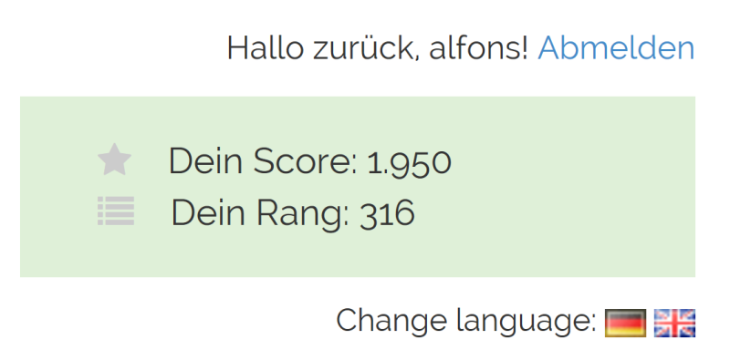 Ich glaube nicht, dass es neben der Punktzahl ein zusätzliches Kriterium für die Platzierung gibt. Wenn Spieler mit gleicher Punktzahl heute einen unterschiedlichen Rang im Highscore haben, wird die Reihenfolge zufällig sein. Am Ende werden Spieler mit gleicher Punktzahl aber gleich gewertet werden.Datterich hat geschrieben:Wie kommt man im vorstehenden Beispiel auf Rang 10 oder Rang 20? Werden im Hintergrund die Anzahl Versuche oder die Ratezeit oder eine Reaktionszeit zusätzlich berücksichtigt?