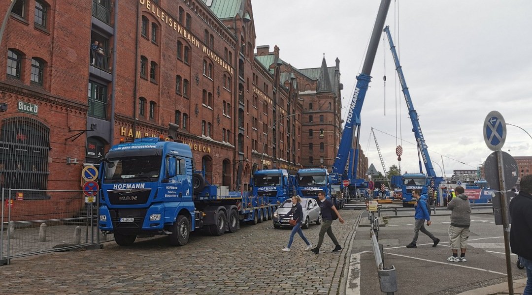 Hamburger Morgenpost hat geschrieben: Um langfristig genug Raum zu haben, hat am frühen Mittwochmorgen die Fertigstellung der neuen Fußgängerbrücke begonnen, die die bestehende Halle mit den angemieteten Räumen auf der anderen Seite des Kehrwiederfleets verbinden soll. Gegen Mittag sollen die Arbeiten abgeschlossen sein – das ist zumindest der Plan der Firma, die für die Montage des Bauwerks zuständig ist.