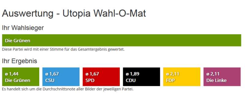 Der Wahl-O-Mat empfahl mir die Partei, bei der nach meiner Erfahrung die Schere zwischen Versprechen und Handeln besonders groß ist. Allerdings lagen die drei "Besten" auch sehr eng beieinander.