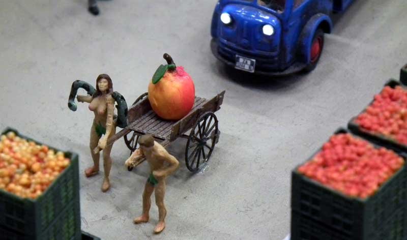 Adam und Eva mit Apfel vor der Saftpresse