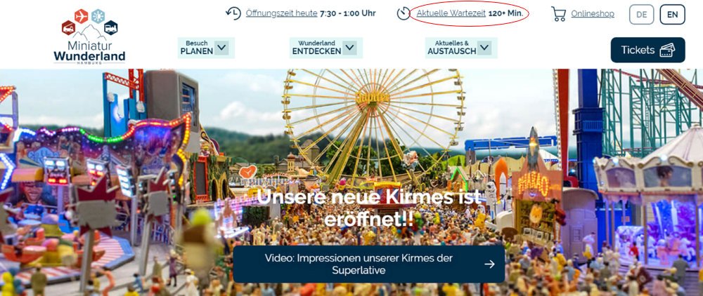 Vor wenigen Minuten betrugen die Wartezeiten über 2 Stunden, wie der Screenshot anzeigt. Schön, dass die augenblicklich zugelassene Maximum-Besucherzahl häufig erreicht wird und sich die Öffnungszeiten (heute 7:30 - 1:00 Uhr am Morgen) offenbar lohnen.