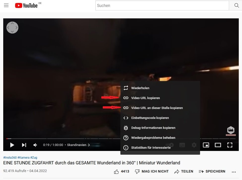 Jedenfalls gibt es bei mir den Knopf "TEILEN" unter dem Video, dort wo man auch auf den "Daumen hoch" etc. klickt. Eben dieses "TEILEN" aufgerufen, liefert diverse Verteilermöglichkeiten, u.a. auch einfach den direkten Link zum Video zum Kopieren, was dann ungefähr so aussieht: Die beiden Pfeile kommen natürlich von mir und zeigen auf den Link, der ohne Zeitstempel erstellt wird.