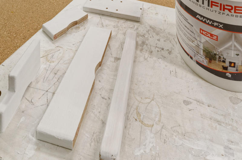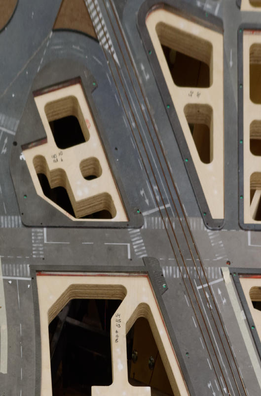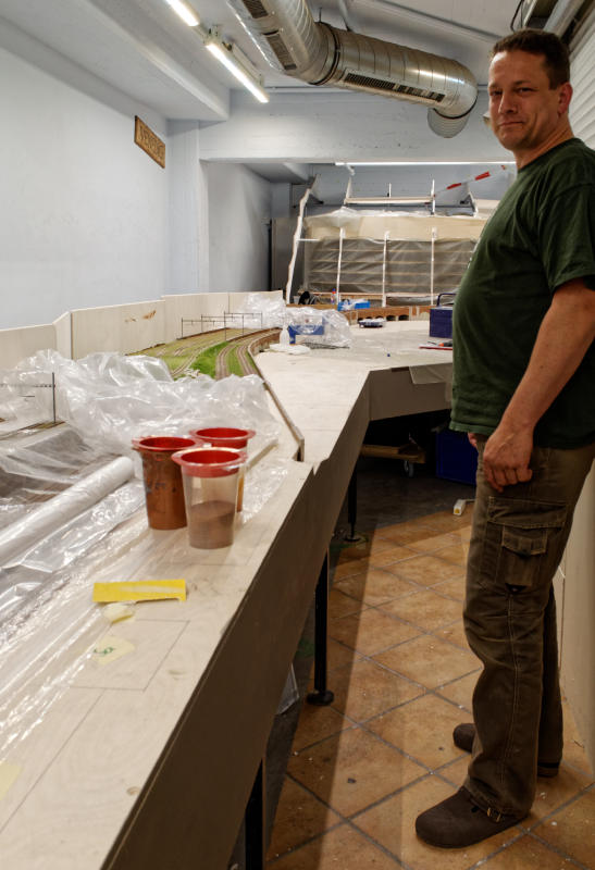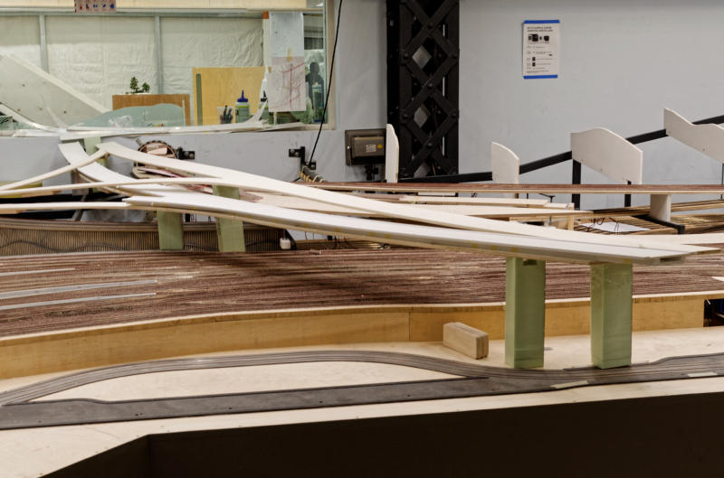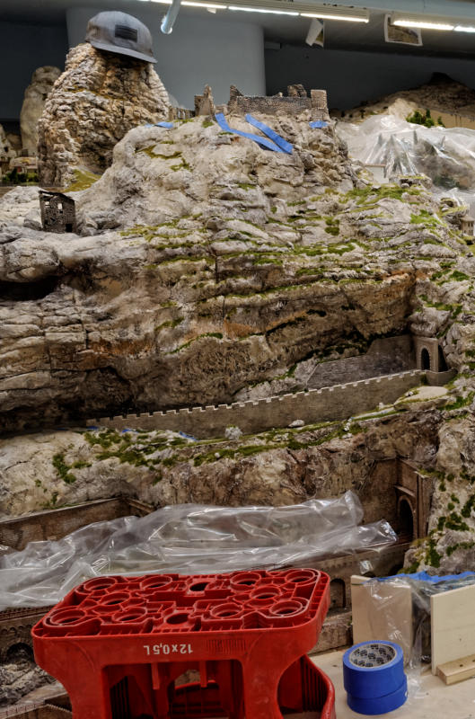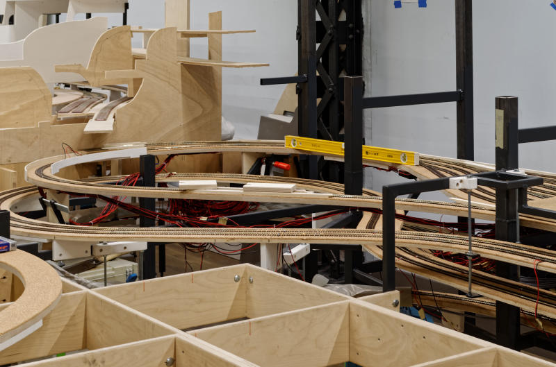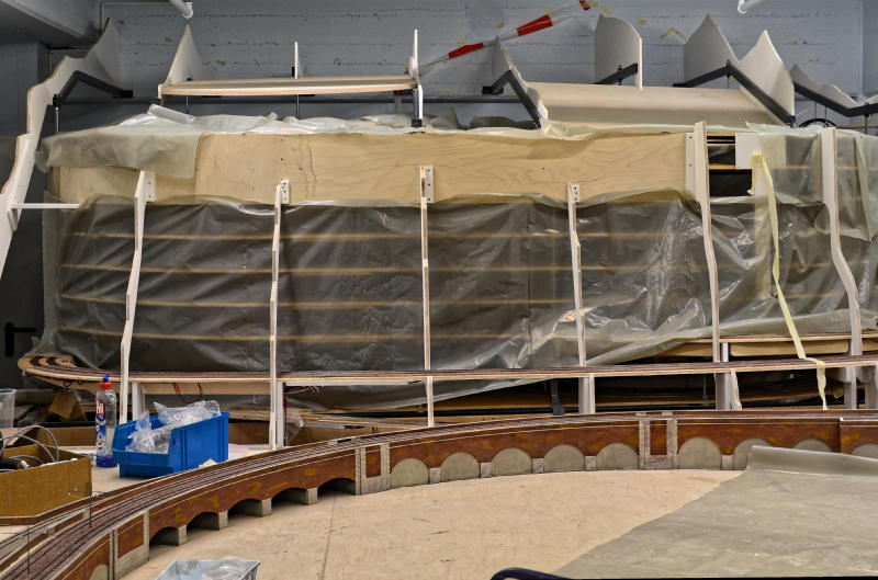 Die Gleiswendel wurde mit Spanten"stückchen" versehen. Langsam lässt sich erahnen, wie sie später im Berg versteckt wird. Man sieht, dass die etwas älteren Teile noch mit Brandschutz-Klarlack angestrichen sind, während für die neueren weiße Brandschutzfarbe verwendet wurde: