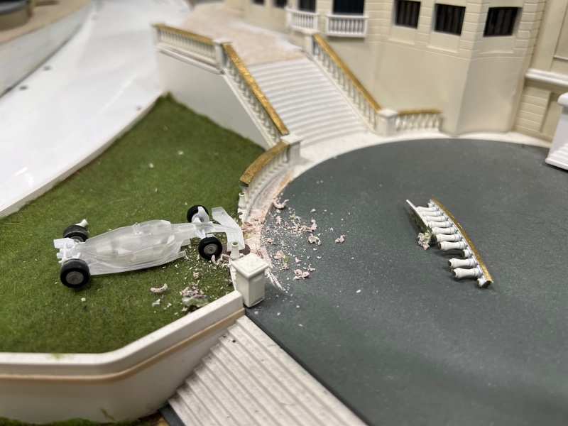 Wenn man das Bild anguckt, hat rechts unter dem Frontflügel der motorisierte Maulwurf zugeschlagen. Die Geschwindigkeit mit der der Bolide eingeschlagen wäre um die Balustrade so zu deformieren hätte auch den Flitzer ziemlich schreddern müssen. Aber so als Ablenkung ist er klasse. Da fällt das Loch des Maulwurfs gar nicht auf.