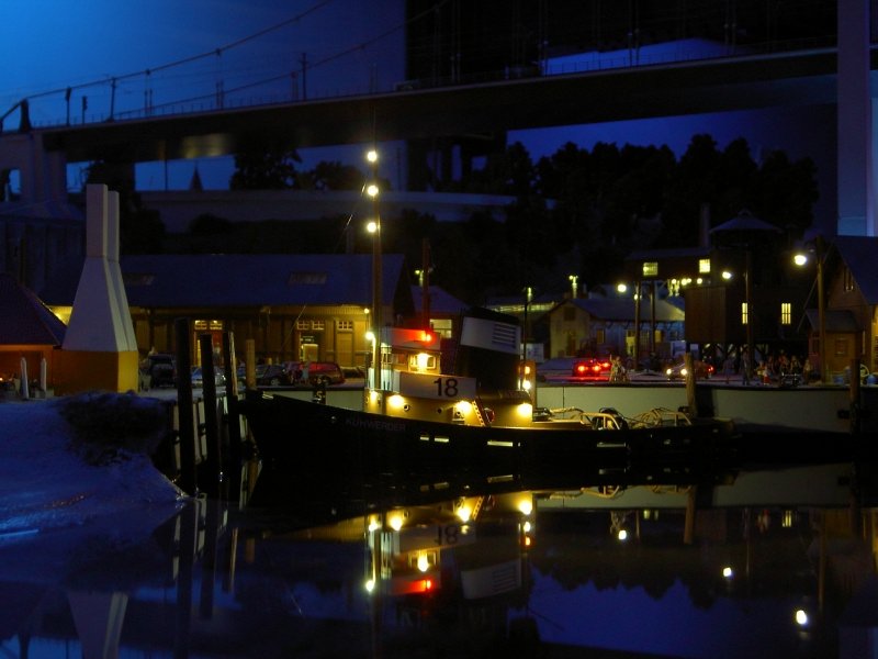 Das Foto von der Skandinavien Baustelle erinnerte mich an etwas. Ich war damals zur Zeit des Baus auch zu Besuch im Wunderland. Zu der Zeit brachte Trix ein paar hochinteressante Bausätze heraus: Speicherstadt, Binnenschiff, Hafenschlepper. Und da hatte ich eine Idee. Ich baue den Hafenschlepper und wenn er fertig ist, dann frage ich Gerrit, ob ich damit auf der NordOstsee fahren darf (wir kannten uns ja schon, ich durfte schon mehrfach die Straßen von Knuffingen benutzen).