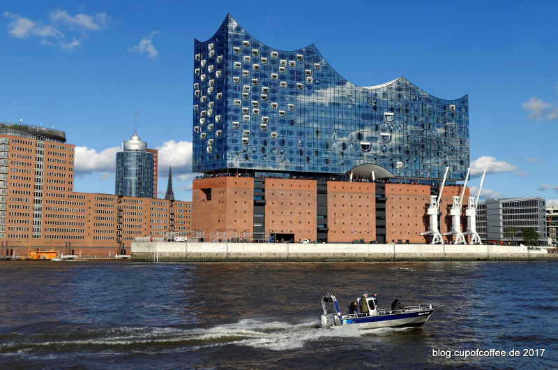 Tag-/Nacht Ansicht - Elphi hat wunderschönen blauen Himmel im Hintergrund (kommt in Hamburg 1:1 seltener vor