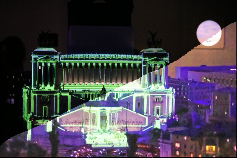 Tag-/Nacht Ansicht - Rom mit falschem Himmel im Hintergrund und fehlender Säule rechts hinter dem Gebäude