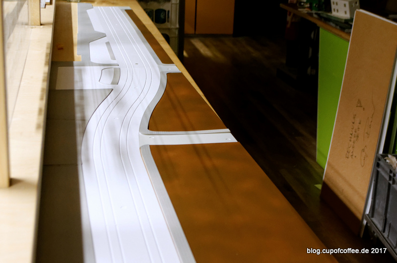 Zu sehen ist, dass die Gleise getauscht werden. Statt der überklebten Außenleitergleise kommen jetzt Fräsprofile zum Einsatz in die die Schienen einzeln hinein geklebt werden.