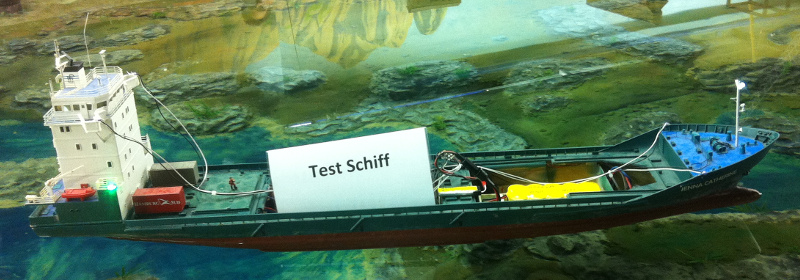 Und das Test-Schiff nochmal von etwas näher. Man erkennt die vier Kabelpaare zu den Ortungspunkten
