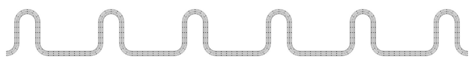 das ist doch kein Problem. Man baut einfach nach dem folgenden Schema Kurven ein:Die Bögen können temperaturbedingte Längenänderungen der Brücke gut abfangen. Die äußeren Gleise sind jeweils für hin- und zurück und das mittlere Gleis ist für Reinigungszüge reserviert, sowie für Züge (BigBoy etc.), die im Märklin-K-Industrieradius (r=295,4mm) zu Entgleisungen neigen.Mr. E-Light hat geschrieben: ↑Freitag 14. Februar 2020, 15:04Tatsächlich? Ist mir da etwas entgangen?![]()