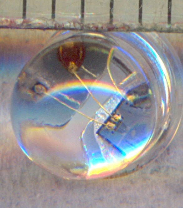 Knifflig wird es, wenn wir von Objekten wie LEDs eine Draufsicht erstellen wollen, dabei muss der Scannerdeckel natürlich offen bleiben. Ein Stück Papier oder Stoff hilft hier, in den die LED mit den Beinchen eingesteckt wird. Bei anderen Objekten muss man sich halt was einfallen lassen. Jetzt starten wir den Scan im „normalen“ Modus, Auflösung immer noch 2400 dpi, das Licht kommt jetzt also von unten (=Betrachterseite). Das Objekt sollte möglichst exakt in der Mitte des Scanners sein, da sonst eine Art „schräger Blickwinkel“ entsteht (im Bild zu bemerken). Die Größe ist jetzt 587 x 667 px, nachdem ich die Ränder etwas abgeschnitten habe. Durch die Kunststoff-Kappe der LED entsteht bei dieser Aufnahme aber eine Verzerrung und dazu noch Reflexe im Regenbogen-Design. Andere Anwendung: