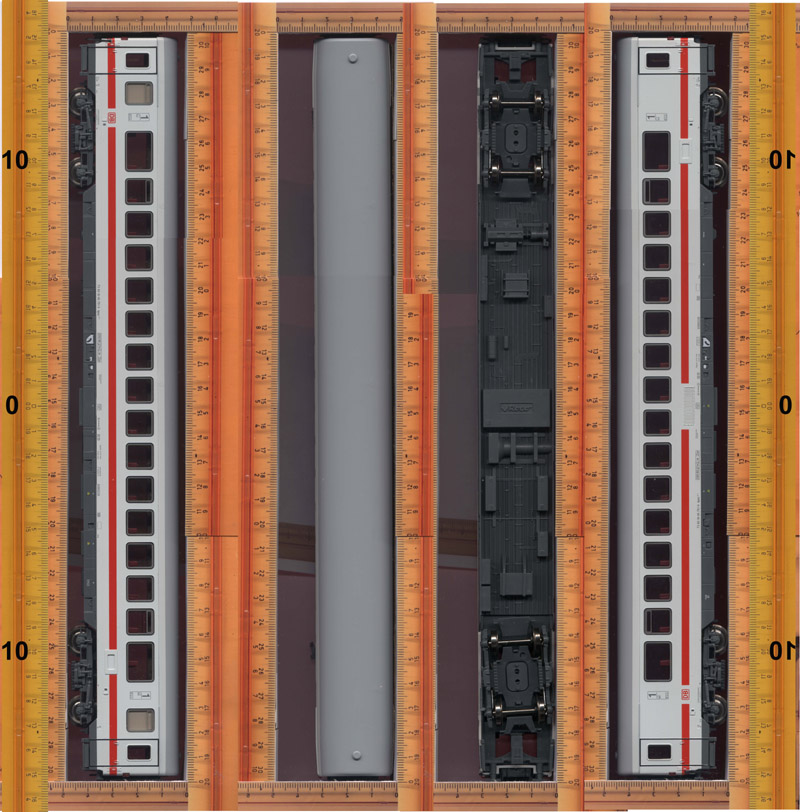 2. Die Loks liegen mit der Schnauze auf dem Scanner und werden am hinteren Pantographen mit Leerverpackung gestützt.