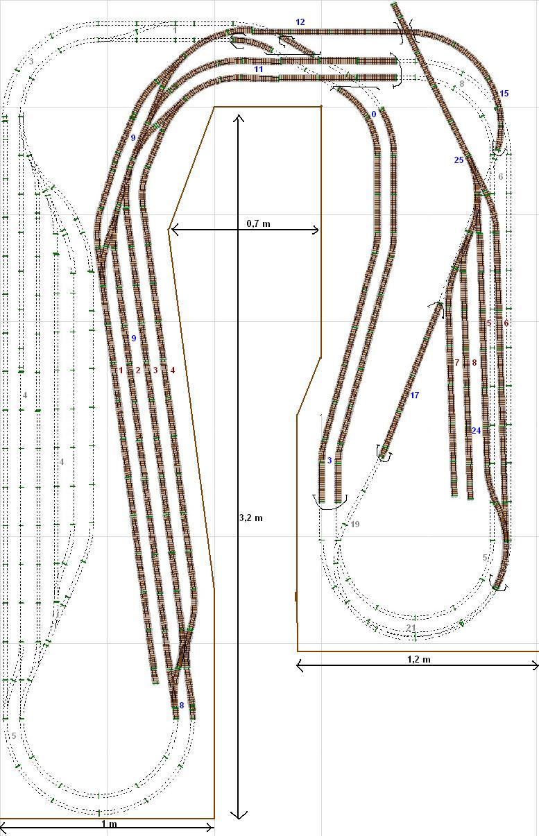 Was mir als erstes auffällt: Der Schattenbahnhof ist ja nur ein paar cm unter dem Niveau des Bahnhofes. Der SB darf also entweder nicht überbaut werden (oder es muß abnehmbar sein) oder er muß von links zugänglich sein. Sonst gibt es keinerlei Möglichkeit entgleiste Züge zu retten.