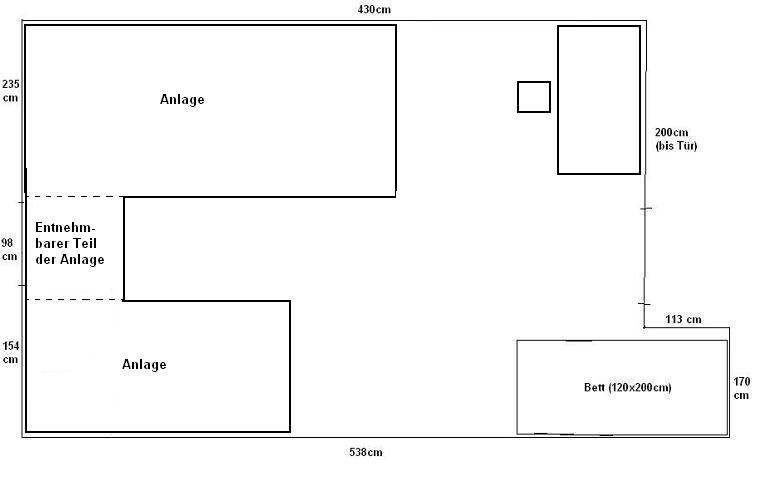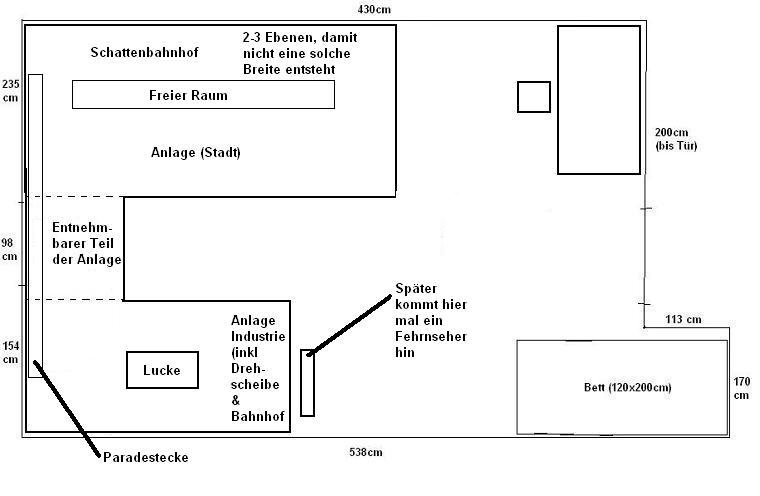 So könnte es meines wissens mit den beiden Ebenen gehen. Die beiden Rechtecke sollen ca den freien Raum dastellen, auch wenn ich noch bisschen was am einzelnen Gleis das da lang geht verändern muss. Sonst ist davor nur Stadt und eine 2 gleisige Strecke, die sich am Anlagenrand langbaumelt. Ein einzelnes Gleis schlängelt sich dann noch auf dem späteren Hügel entlang. Auf dem Linken Anlagenteil ist ein größerer Bahnhof und eine Drehscheibe. Da wäre auch noch platz für weitere Industriegebäude. Der halbkreis, den ich von Hand weiter gezogen habe, geht wärend er den Bogen macht etwas herunter und an der einen Seite zur Drehscheibe hin ist eine Mauer, die den Höhenausgleich zwischen Drehscheibe und dem Gleis dastellt. Im mittleren Anlagenteil ist eine (leider nur kurze) Paradestrecke und wieder die 2 gleisige Strecke.