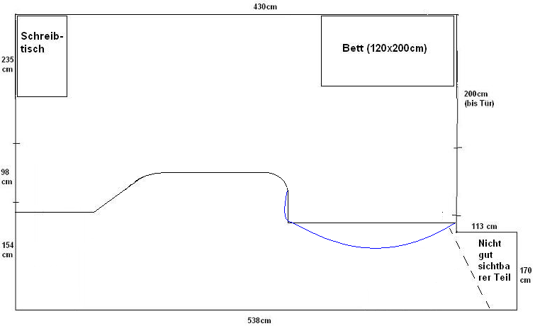 Ganz an der Wand (siehe Skizze oben) beträgt die Raumhöhe ca 77 cm. Dies deswegen, da diese Wand angeschrägt ist, weil der Raum sich unter dem Dach sich befindet. Der Raum aber ist ausgebaut. Die, von der Skizze aus, linke Tür hat keine Tür eingebaut, sondern ist einfach nur eine art Bogen in die Wand. Von der Tür 40cm weiter rechts (in der Skizze 40 cm weiter oben, linke Wand) ist die höchste Raumhöhe erreicht mit 233cm höhe. Weitere Maße wie gesagt auf der (nicht maßstabsgetreuen) Skizze.