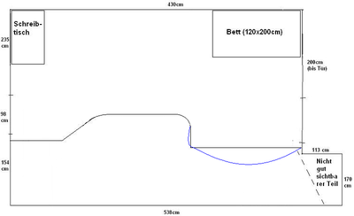 -Anlagengröße: 430x235cm (habe einen anderen Raum zum Glück zur Verfügung bekommen!) wobei es Probleme geben könnte wegen der Raumhöhe (komme später nochmal darauf zurück!)