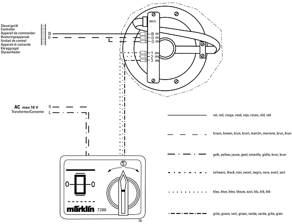 Die Handsteuerung ist an einen Märklin Trafo angeschlossen. Ausgangsspannung 16V Wechselstrom, so wie es in der Anleitung steht.