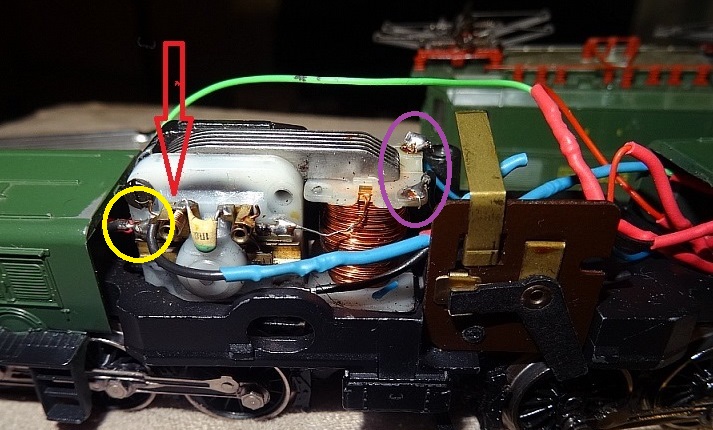 Beim violetten Kreis müssen das blaue und das grüne Kabel vom FRU angeschlossen werden, je ein Kabel geht von dort zur vorderen bzw. hinteren Glühbirne. An den Oberleitungsumschalter geht das rote Kabel vom FRU, das braune Kabel vom FRU verbindest Du mit Masse (= Chassis), z.B. an der Lötfahne an der einen Motorschlidschraube.