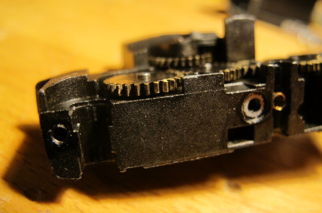 6. Habe ich die Zahnräder ausgebaut, indem ich die Bolzen von der anderen Seite mit einem stumpfen Nagel und einem Uhrmacherhammer vorsichtig herausgeschlagen habe. (Man kann zu diesem Zweck den Antriebsblock auch in einen Schraubstock einspannen.)