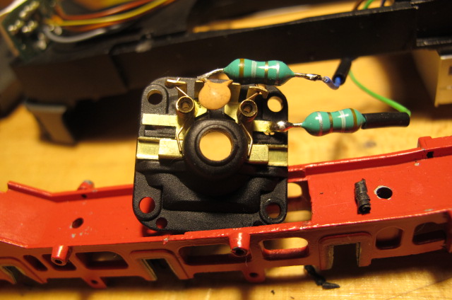 1. Habe ich die Lok soweit auseinandergenommen, dass der Motor-Getriebeblock ausgebaut und nur durch drei Kabel an die Lok gebunden vor mir stand.