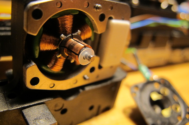 *Den Anker habe ich bei der Gelegenheit mal in meinen Feinbohrschleifer eingespannt und den Kollektor mit einer Edelkorund-Scheibe nahezu perfekt sauber bekommen. Achtung: Irgendwann fliegt der Anker aus der Werkzeugaufnahme des Feinbohrschleifers, da nur ein kleines Stück Ankerwelle zur Befestigung zur Verfügung steht. Muss man aufpassen! Außerdem muss man nach der Prozedur die Anker-Wicklungen entstauben. Ich habe das mit einer Airbrush-Pistole gemacht (ohne Farbe selbstverständlich!).
