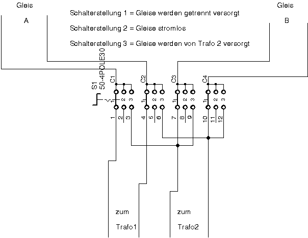 Ich schlage einen 2-poligen Umschalter vor, so etwa dieses Modell: Die Verdrahtung nach folgendem Schema: Am Schalter wären die Lötösen so zu verdrahten: Auf die Idee, zwei Bereiche mit nur einem Fahrgerät zu versorgen, wäre ich gar nicht gekommen. Ich habe gerne viele Fahrgeräte um mich herum.