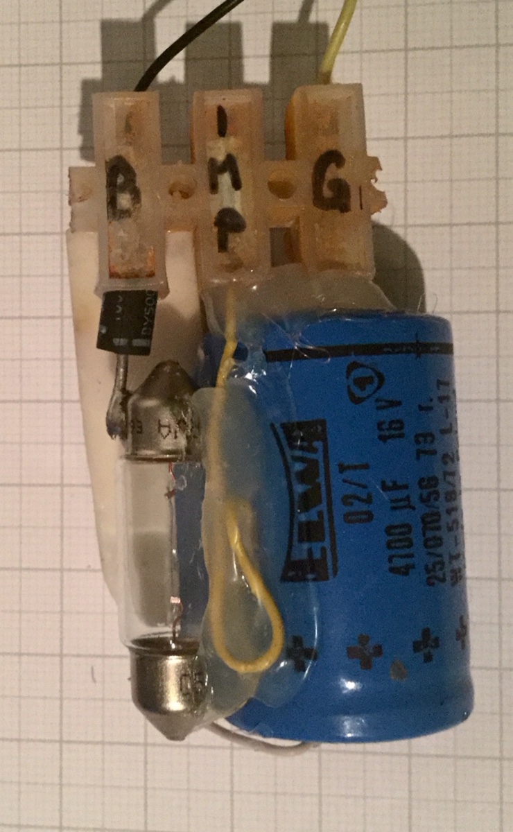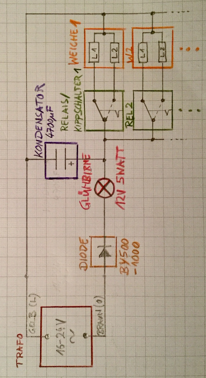 Die Diode (aus einem alten Ladegerät) sorgt für Gleichstrom. Der Kondensator (aus einem Röhrenfernseher, alternativ auch mehrere kleine in Reihe) kann sich aufladen. Das funktioniert in dem Wechselstromkreis leider nicht. Dann fängt die Glühbirne (Standlicht oder Innenraumbeleuchtung KFZ) an zu leuchten und es fließt ein unschädlicher Strom über die geschalteten Weichenspulen. Wird eine andere Weichenspule angewählt, entlädt sich der Kondensator und liefert den Impuls um die Weichenstellung zu ändern. Danach läd er sich wieder auf.