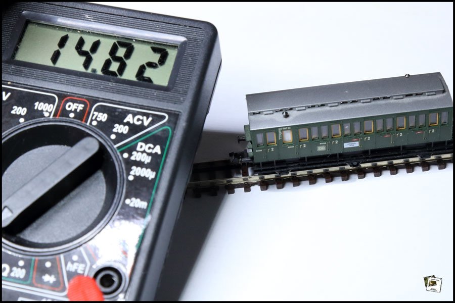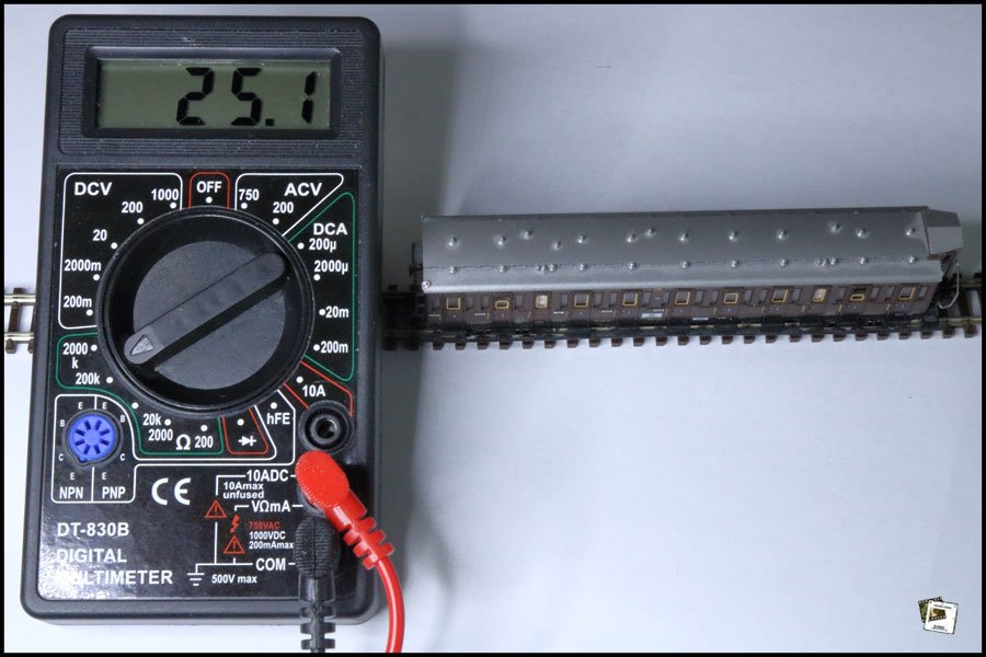 Nach gefühlt 1284 Versuchen habe ich es heute endlich geschafft, einen SMD-Chipwiderstand, 0603, 15K, 1% so an der Achse meines Fleischmann Postwagens Kaiserliche Post 2678 anzubringen, dass die Achse einen Widerstand von 14,7 k-Ohm aufweist.