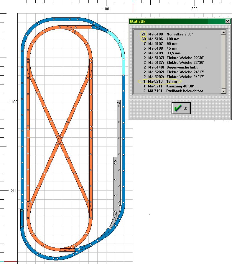 1 gerades Gleis 5210, 16 mm (falls die fehlenden Gleise nicht ohnehin vorhanden sind)