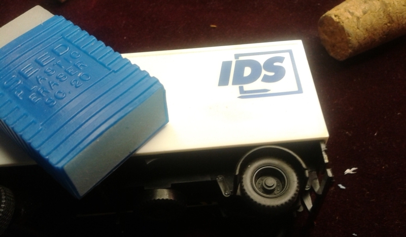 Wenn der Aufdruck nicht zu Großflächig ist, hilft auch die rote Seite von einem blau/roten Radiergummi. Damit hbe ich zum Beispiel schon öfter die Namen von ICE entfernt. Wichtig dabei ist, immer eine gute Kante zu haben, damit man sehr genau nur die störende Bedruckung bearbeiten kann.