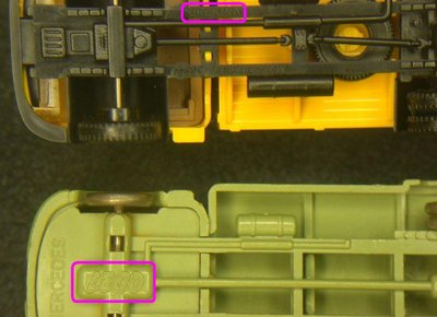 @ GüNNi: ganz recht, die Billunder Motoren Werke hatten immer die Ganzmetall-Bereifung, außerdem haben sie keine Gelegenheit ausgelassen, ihr Firmenzeichen auf ihre Produkte zu prägen, "...und ist der Stein auch noch so klein!" Hier zum Vergleich zwei Rundhauber-Mercedes. Und das Pärchen von unten, durch die Lupe geknipst: Im Profil kommt der Billunder etwas niedriger daher, dafür ist sein Radstand gegenüber dem Teninger Kollegen geringfügig länger. Im Fahrverhalten lässt die Griffigkeit der Dänischen Reifen, insbesondere auf nasser Fahrbahn, einiges zu wünschen übrig. Soviel zum LKW-Kurz-Test.