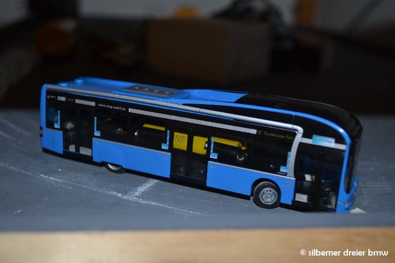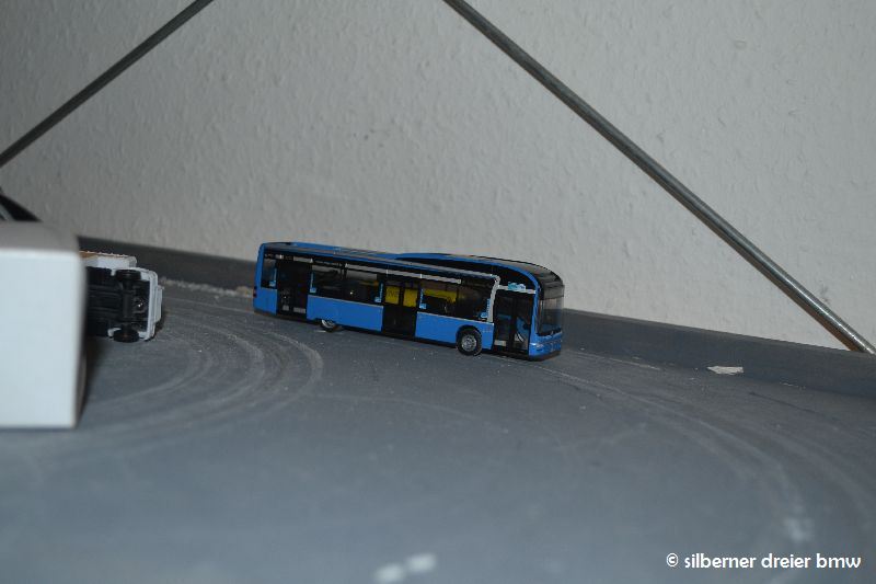 Ihr werdet es nicht glauben, aber ich habe mein ersten (Halbwegs)Eigenbau fertiggestellt. Es ist ein MAN Lion's City Hybrid der Münchner Verkehrsgesellschaft MVG. Als Basis diente dieser Car-System Bus: 161506. Der Aufbau stammt von einem Rietze-Bus im Vertrieb der MVG. Ich habe dem Chassis einfach einen AAA-Zellenhalter verpasst und die Karosserie an das Chassis angepasst. LEDs sind auch schon eingebaut, aber noch nicht angeschlossen.