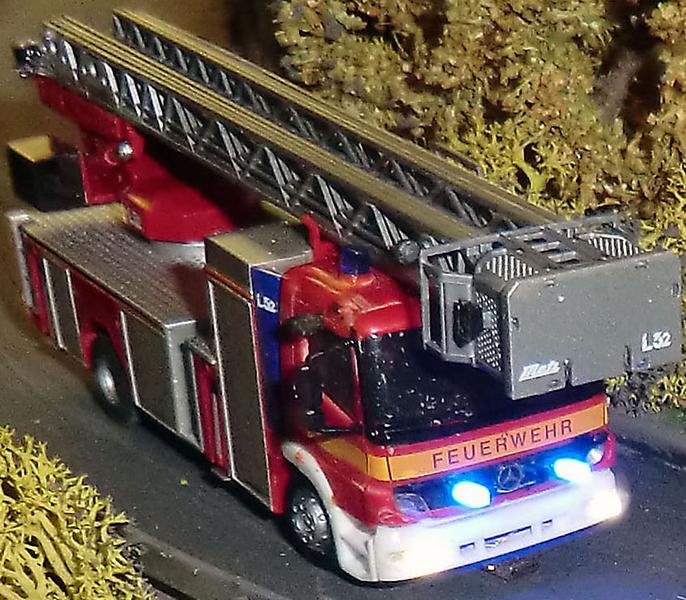 ich wollte mich mal umhören, wer bisher schon eine Drehleiter mit Licht auf Faller Car System wie umgebaut hat. Habe selbst gerade meine erste fertiggebaut und stel sie mal kurz vor. Das Modell kommt von Herpa (Best.-Nr.: 047524). In E-bay habe ich mir einen Umrüstsatz ersteigert. Die Elektronik für die Fahrbeleuchtung ist bei mir das Tams Modul FCS-L und steuert zwei weiße SMD-LED 0805 und zwei rote SMD-LED 0805 an. Für die Blaulichter benutzte ich ebenfalls diese LED-Größe nur halt in blau. Sie werden angesteuert über das Tams-Modul FCS-1. Als Spannungsversorgung dienen zwei 170mAh NiMH-Akkusmit 1,2V (in Reihe 2,4V).