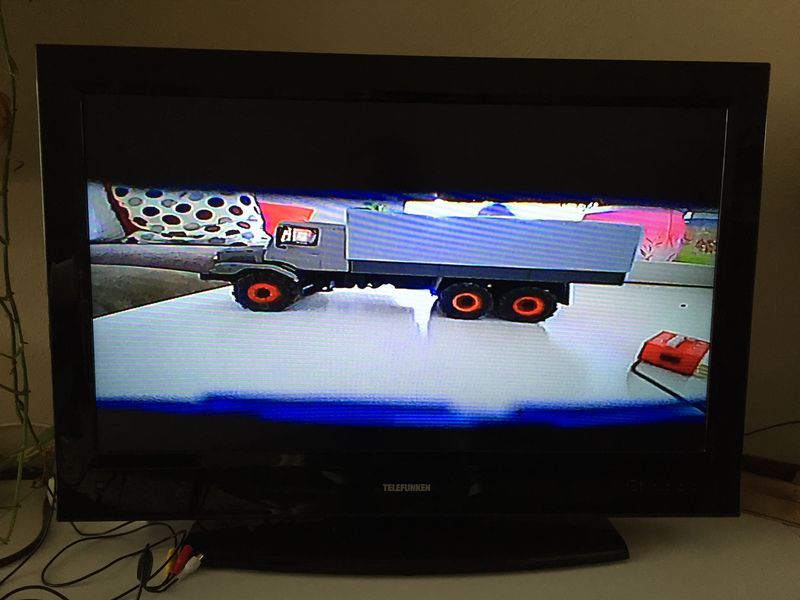Das Platzangebot in der Zugmaschine des Gigaliners scheint fürs erste ausreichend und sollte genug Platz bieten. Bei ersten Tests stellte sich heraus, dass die Sendeplatine recht warm wird. Der Rest der Komponenten aber sehr gut miteinander harmonieren. Die Anordnung der Komponenten im Truck wurde neu überdacht und angepasst. Gleichzeitig wurde berücksichtigt, dass noch mehr Komponenten im Laufe der Zeit den Weg in dieses Modell finden sollen und werden. Die Kamera bietet zwar einen Blickwinkel von 170 Grad aber eigentlich wollte ich noch ein bisshcen mehr, als musste noch eine Lösung gefunden werden, wie man die Kamera drehbar bekommt. Am besten noch unabhängig von der Lenkung. Einen freien Kanal beim Empfänger zu finden, war das kleinste Problem (18 Kanäle) eher der Platz im Führerhaus. Für die Lenkung platziere ich normalerweise ein Servo direkt über der Vorderachse. Diese drehte ich einfach um, auf diese weise ist das Servo mittig im Fahrzeug und ich kann die Kamera direkt auf das Servohorn platzieren. Problematisch erwise sich hier allerdings, das ich das Fahrzeug vorne ca. 1,5mm tiefer gelegt hatte. Diese fehlten mir nun im Führerhaus. Die Kamera zeigte mehr Sonnenblende als alles andere. Durch Optimierung des Servohebels und das Neigen der Kamera konnte ich den Bildausschnitt so anpassen, dass das Kamerabild dem eines wirklichen Blickes aus dem Führerhaus sehr ähnelt.