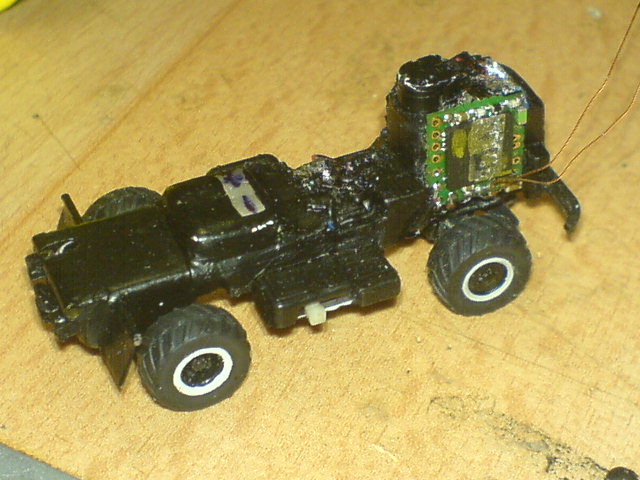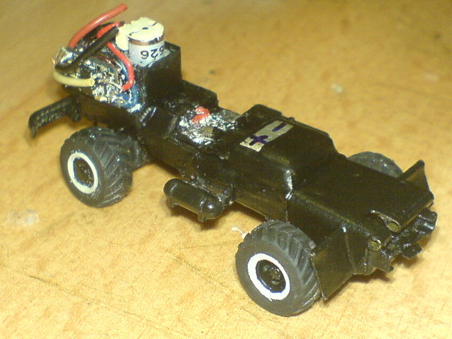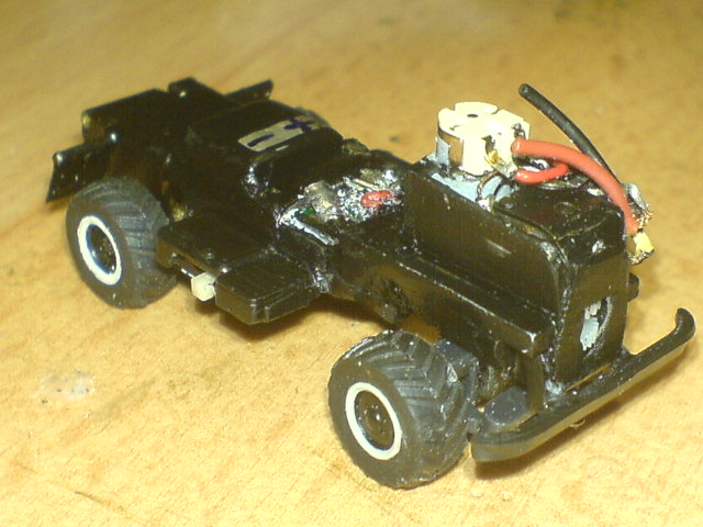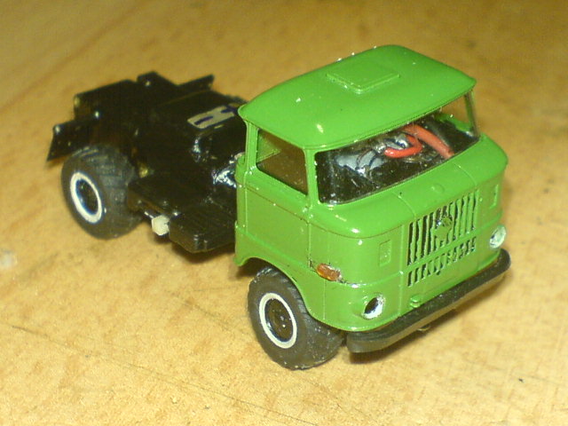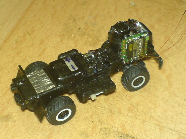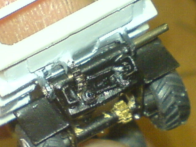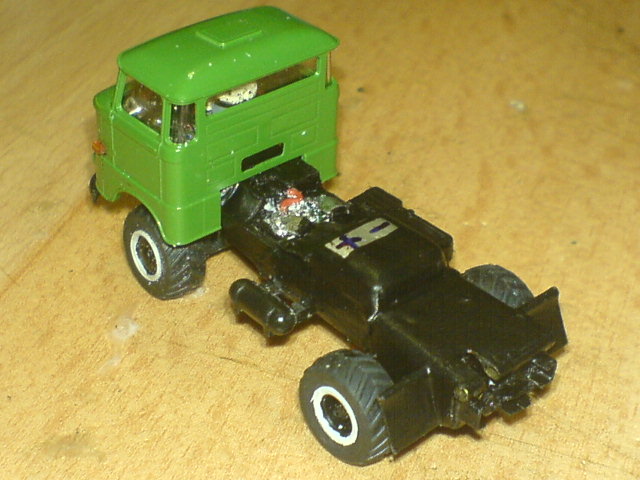 Dafür habe ich hinten am Rahmenende noch die nötigen "Anschuhungen" vorgenommen, die zuvor wieder aus mit Sekundenkleber verstärktem Papier gefertigt wurden, genau, wie die Anhängerkupplung. (das "Kleberpapier" gefällt mir mittlerweile sehr, eine feine Sache für solche "Improvisationen"