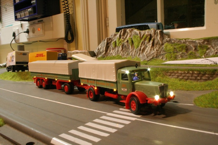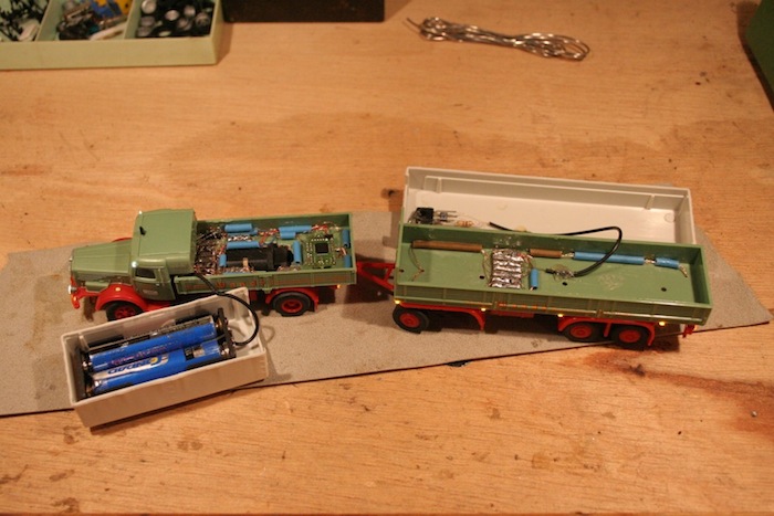 Das Modell von Herpa wurde mit original Faller Lenkachse und Motor + Halterung sowie einem DC-05 ausgestattet. Da wir in unserem Verein via Infrarot und PC steuern, war ein TSOP Empfänger nötig, der aus Platzgründen im Hänger angebracht wurde. Der Hänger lässt sich deshalb auch nicht von der Zugmaschine trennen. Insgesamt laufen 8 Drähte durch kleine Kanäle unter der Deichsel fast unsichtbar in den Hänger.