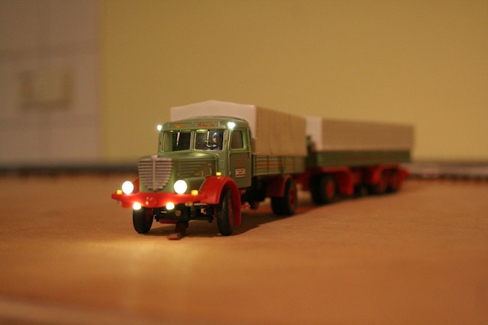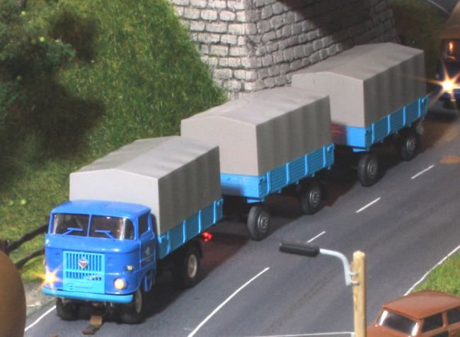 nach zeitraubenden Arbeiten am endlich fertiggestellten Bachstein-Modul darf ich jetzt endlich wieder Fahrzeuge umbauen. Hier mein neuester Truck - ein W50 mit 2 Hängern, die sind früher wirklich im Osten so rumgefahren. Das H0 Standmodell wurde fahrtüchtig gemacht und ist auf DC-Car umgebaut. Vorbildgerecht fehlen die SBL.
