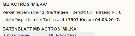 Das bedeutet, dass dieses Fahrzeug laut Datenblatt vom 02.08.17 bis zum 04.08.17 rund 7 Kilometer (echte in 1:1) gefahren ist. Mal abgesehen vom raschen Inspektions-Intervall erscheinen mir diese Angaben nun doch irgendwie seltsam: So viel Schokolade kann doch gar nicht transportiert worden sein ... oder wars die Tachomafia?Datenblatt am 05.08.2017 hat geschrieben:Letzte Inspektion bei Tachostand 17507 Km am 04.08.2017.
