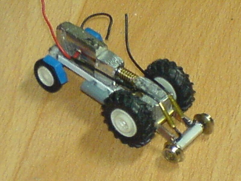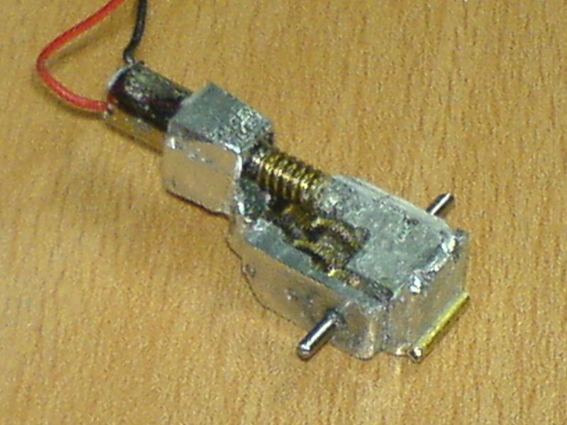 Nach provisorischem Anschluss eines Akkus zur Spannungsversorgung wurde auch sogleich versucht, die Bedenken, das Fahrzeug würde zu leicht für seinen Bestimmungszweck sein, aus dem Weg zuräumen und einen mit div. schweren Bleistücken und mehreren Motoren beladenen 4 achs. Güterwagen auf einem Stück Testgleis zu bewegen.