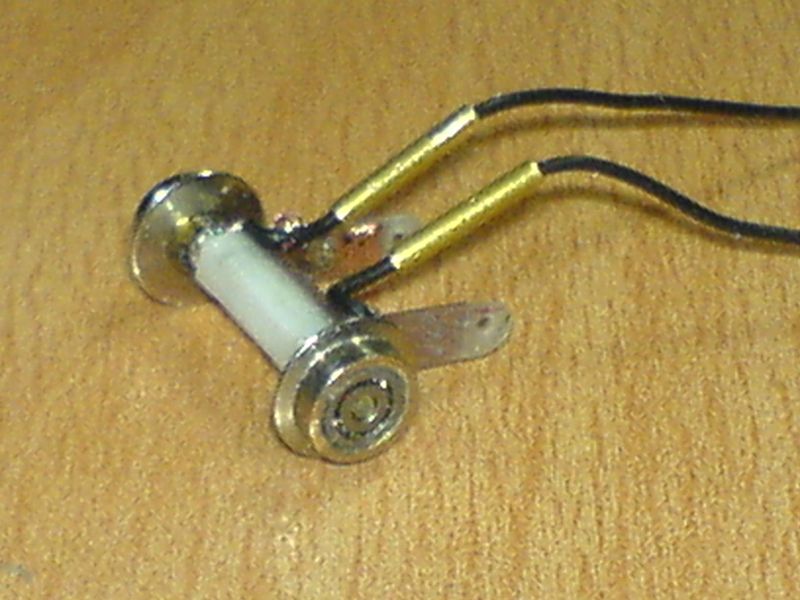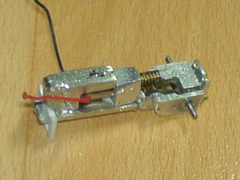 Diese wurden dann durch kleine 4mm Kugellager ersetzt, um zu gewährleisten, dass Schleifer o.ä. zur Spannungsabnahme nicht benötigt werden. Die Kombination von Kugellager und Radscheibe, aufgezogen bzw. montiert an den Aufhängungen der Schienenfahrwerke fungieren quasi als Stromabnehmer und Schleifer in einem. Nur eben ohne bzw. mit gaaanz wenig mechanischen Hemmungswiderstand der erforderlichen leichgängigen Bewegung der durch geteilte Achsen gegeneinander isolierten Radscheiben und als eigentliche Verbindung zur Stromabnahme eingesetzten metallischen Achsbolzen in den Lagern. (Bild 6 )
