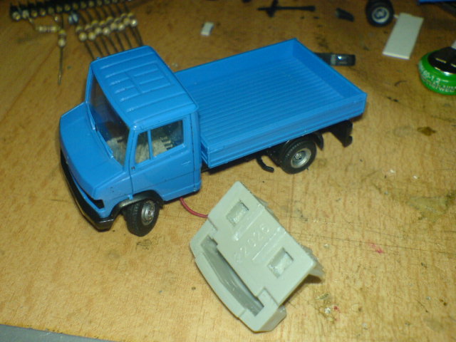 Gut, einige "kosmetische Arbeiten" sind auch noch zu machen, den Akku z.B. noch mit etwas passender Farbe wegtarnen(Fahrer- und Beifahrerfigur wäre auch so verkehrt nicht), die Blinker und Rückleuchten anmalen usw., aber im Grunde steht er dann schon in der Form fertig da.