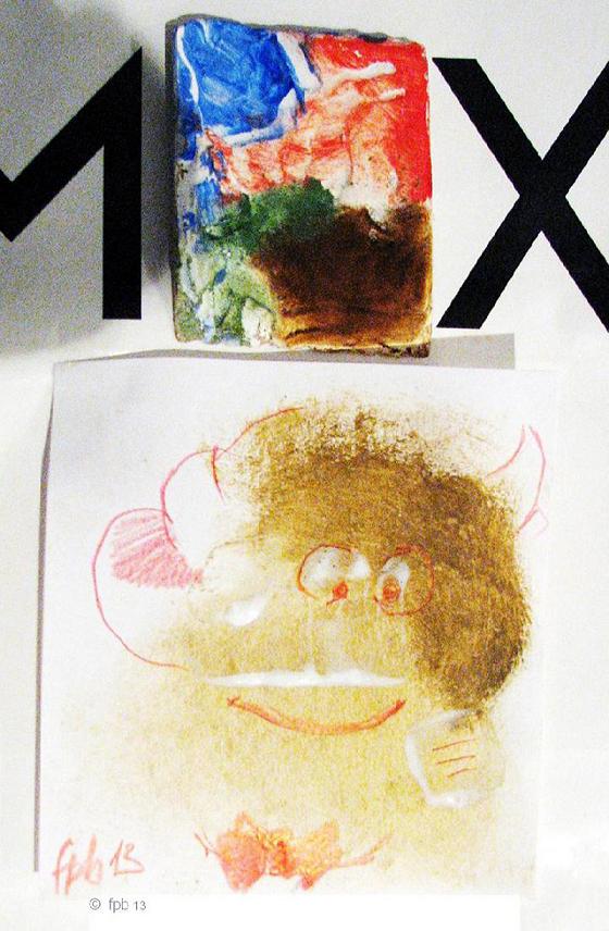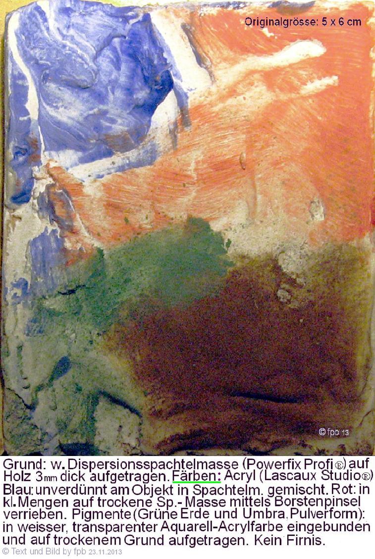 Zum Dingsda also: Ist ein Malgrund glatt oder sonst nicht besonders saugend, kann mit einem <Gesso> grundiert werden. Farben spärlich und unverdünnt "einreiben" ist Übungssache. Stets kleine Einheiten kaufen: gebrauchsfertige Akrylfarben in 35 ml Tuben bzw. 125 ml Flaschen reichen sehr weit.
