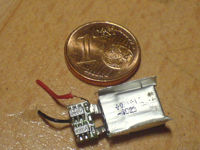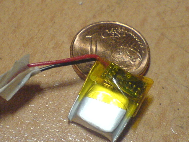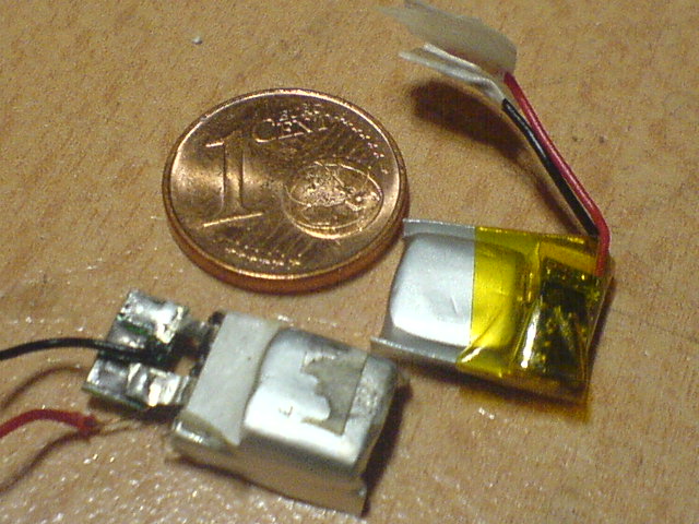 Bei Ebay fand ich (glücklicherweise) durch Zufall einen Händler, der kleine LiPo Zellen mit ca. 10x10x3mm im Angebot hat, die sogar mit 30mAh aufwarten können