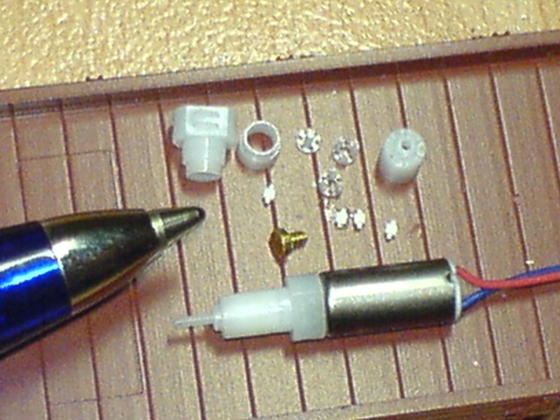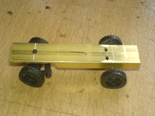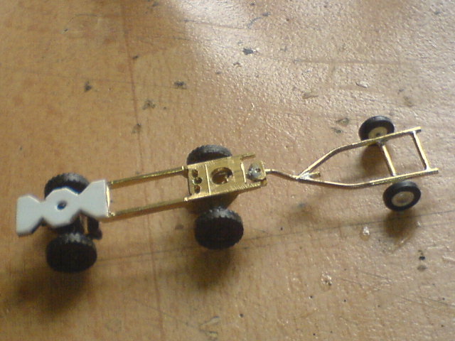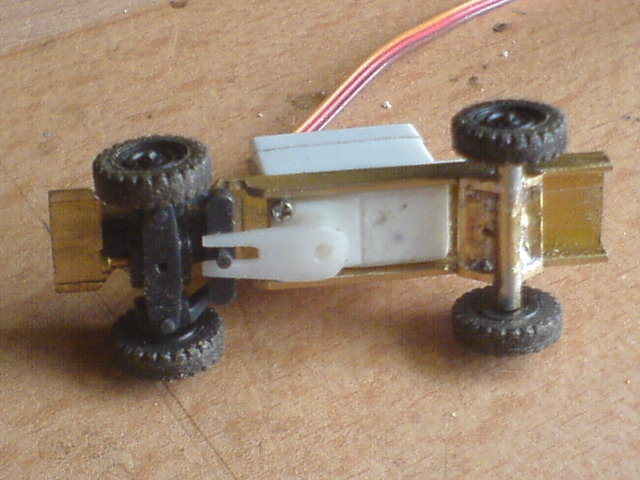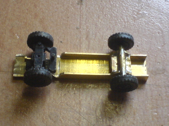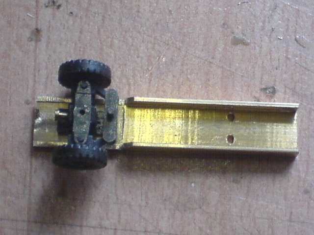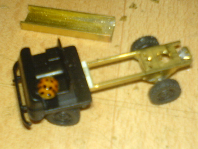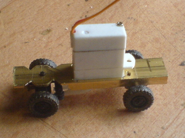 Das Fahrgestell wurde in bewährter Art aus Messingprofil erstellt, mit dem passendem Servo von HobbyKing versehen und als Motor ist ein 4mm Getriebemotor angedacht, der auch beim Getriebe der Liftachse vom Volvo zum Einsatz kommt.