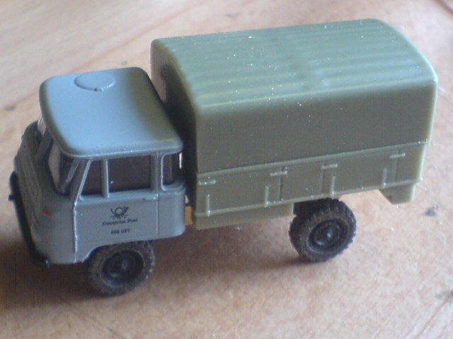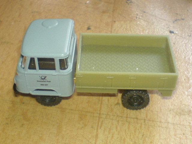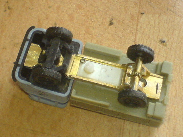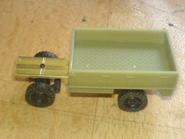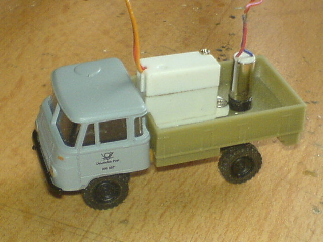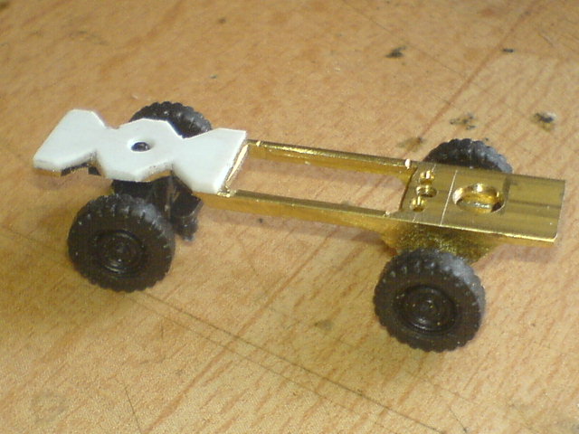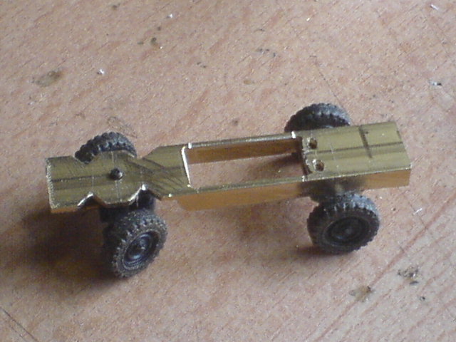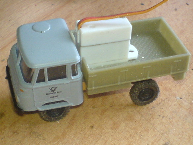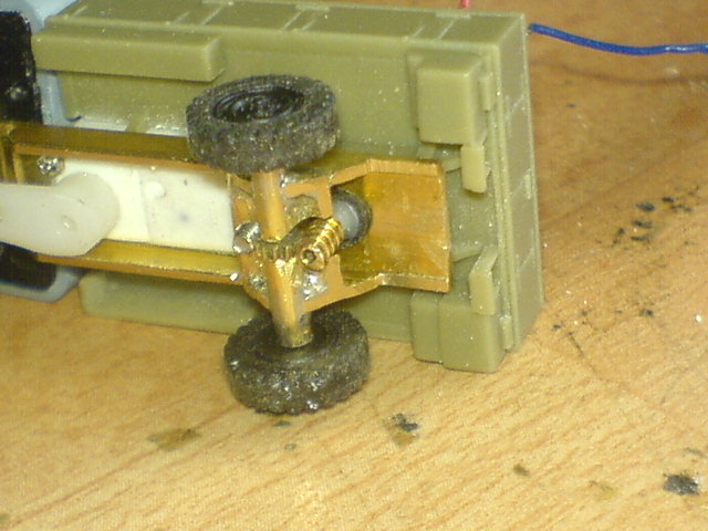 Die Räder sind ein Mix aus H0 Teilen, wofür Teile (Felgen) vom Roco Landrover und Toyota Landcruiser von Busch (Reifen) in der Bastelkiste aufgestöbert wurden.