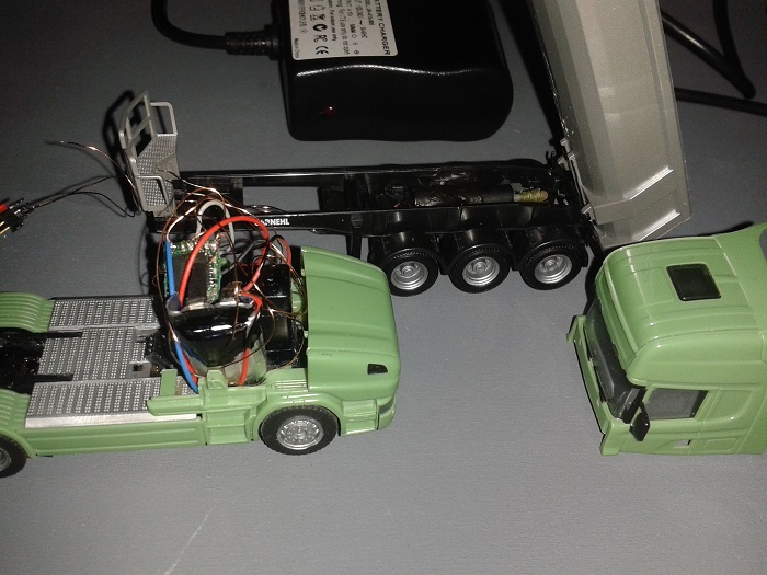 Ja genau, die gesamte Technik ist im Führerhaus verbaut. So kann ich verschiedene Auflieger anhängen. Verbunden werden die Auflieger mit einer 3-poligen Rasterbuchse (+,-,i). Der Kipperauflieger kann natürlich kippen, ich muss das allerdings noch etwas überarbeiten. Die Mulde wird mittels Angelschnur und Planetengetriebe hochgezogen und abgelassen. Ich hab dir mal ein Foto geknipst: