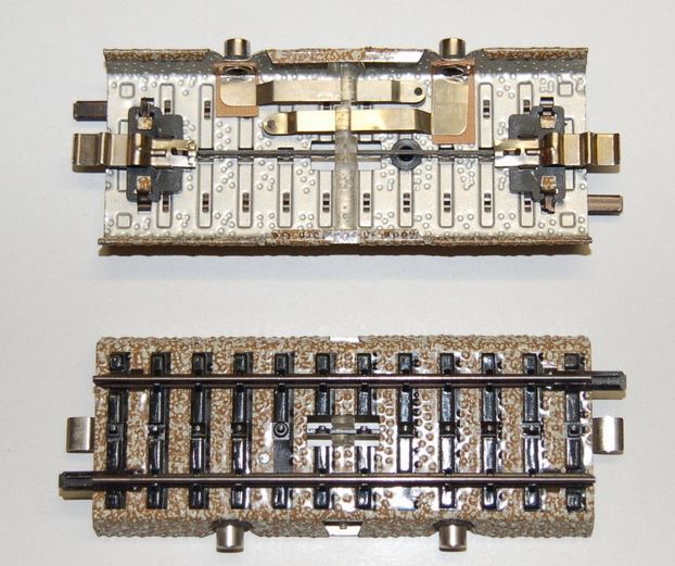 Die stöpseln wir an ein Schaltgleis. Kommt jetzt ein Schleifer, wird die hauchdünne Kontaktzunge an den Böschungskörper gedrückt, der mit dem anderen Pol der Stromversorgung über das BRAUNE Kabel am Anschlussgleis verbunden ist. Beim M-Gleis ist der gesamte Gleiskörper "Masse".