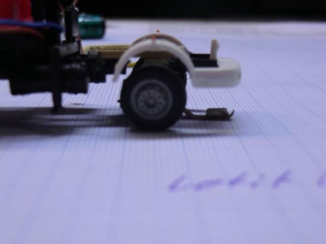 Danach die Vorderachse ausgebaut, Kotflügel zurückgeschnitten und Kabineninnenraum demontiert. Daraufhin mit Messing die Halterung der Lenkachse gebaut (Bild 3) und Lenkachse drangeklebt (Bild 1).