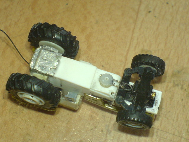 Ein kleiner Servo passt von der Breite her genau zum Fahrgestell des Treckers und wurde hinten, quasi als Getriebeblock, an das Vorderteil angeklebt.
